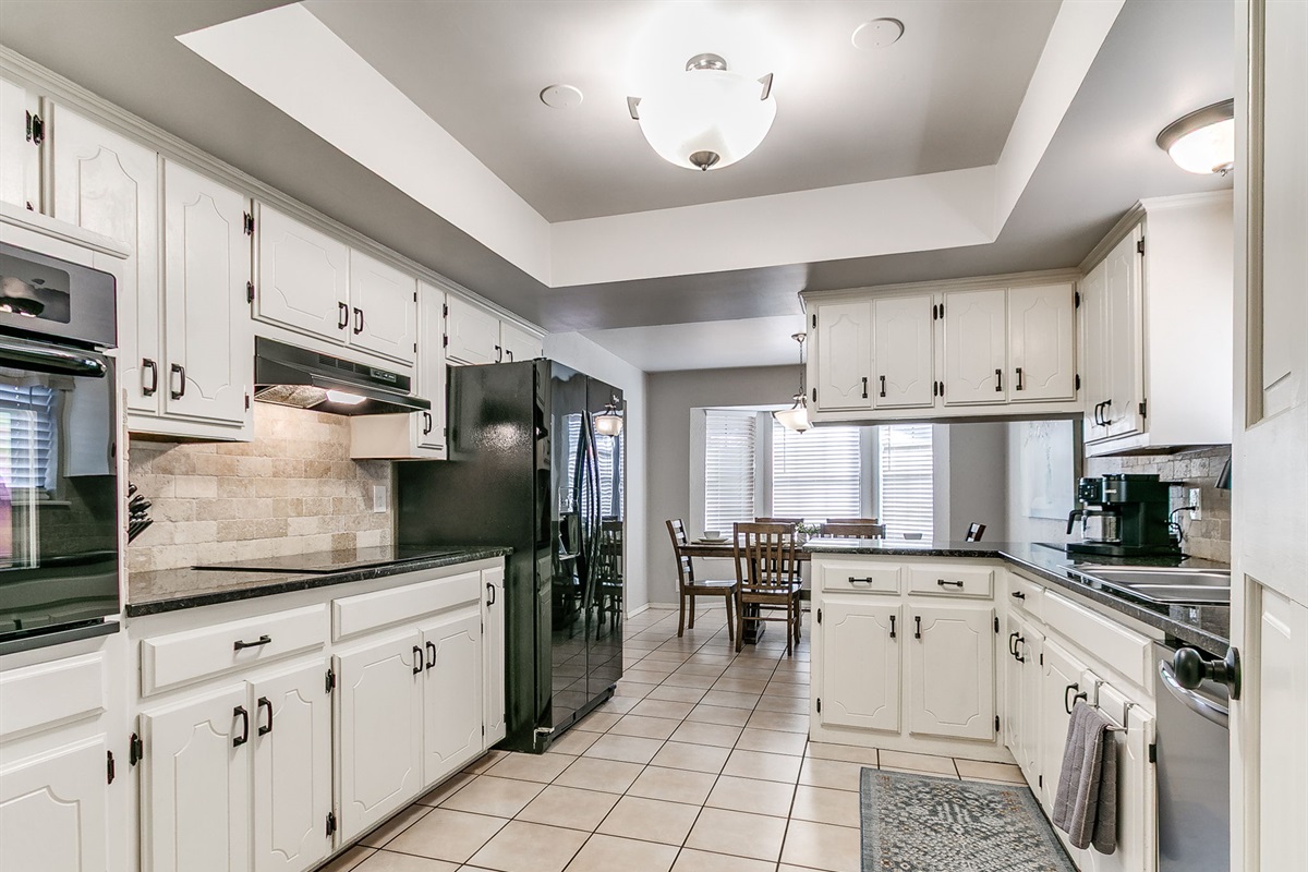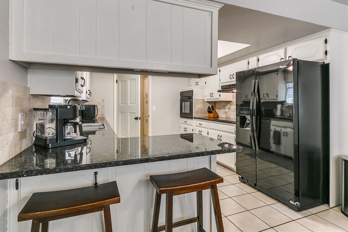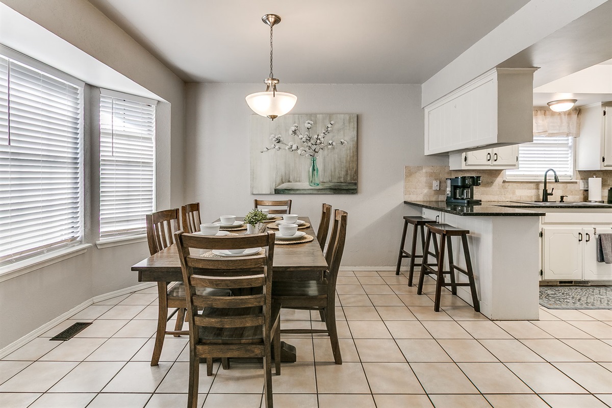 The kitchen features granite countertops, modern appliances, and ample space for meal preparation. A large dining table allows for shared meals or additional workspace during extended stays.