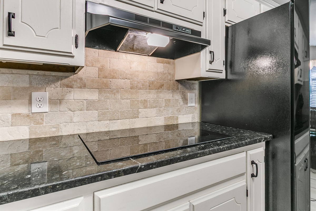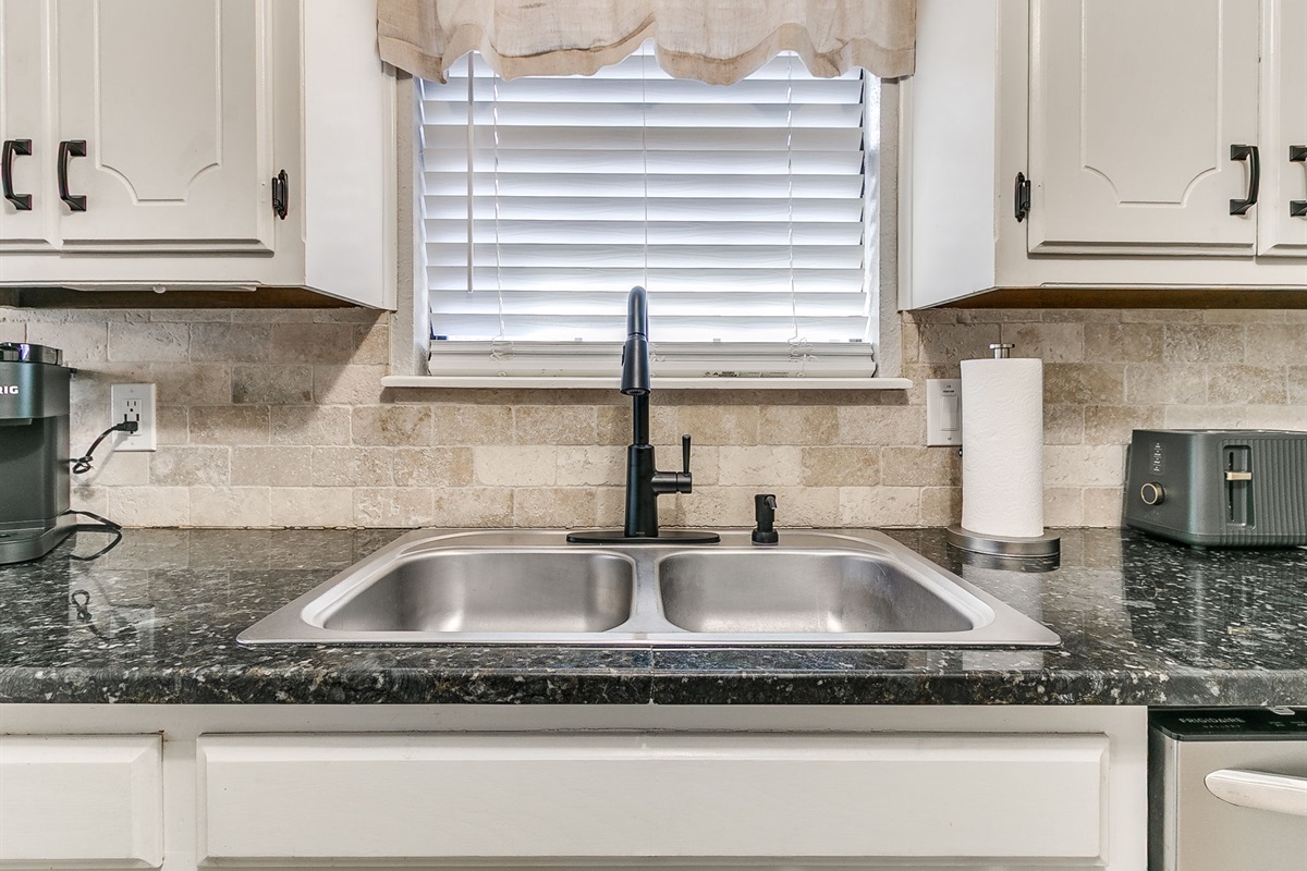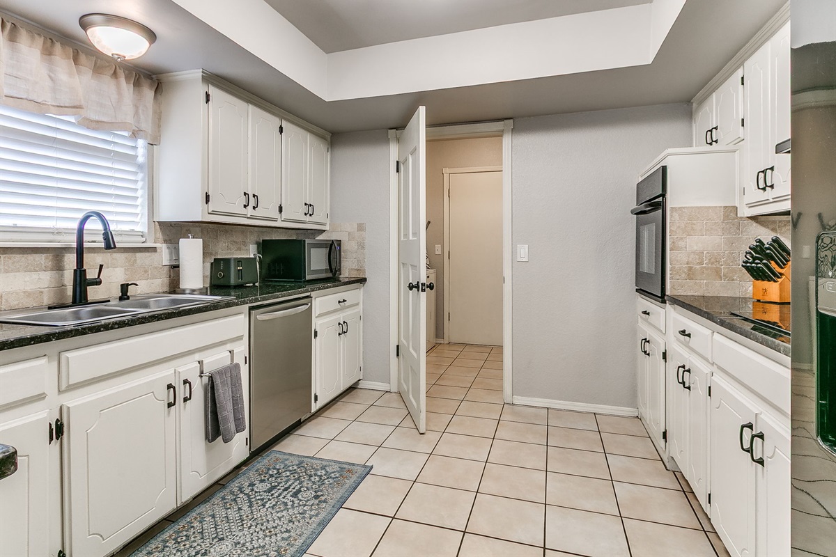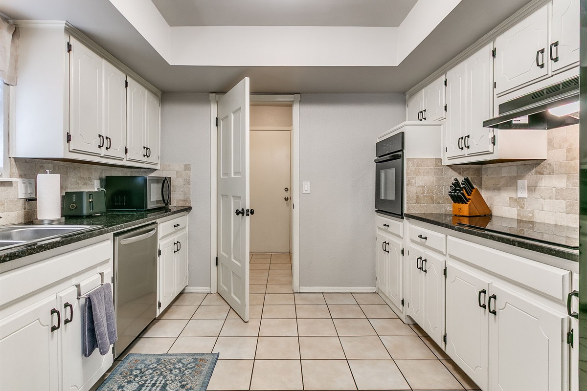 The kitchen features granite countertops, modern appliances, and ample space for meal preparation. A large dining table allows for shared meals or additional workspace during extended stays.