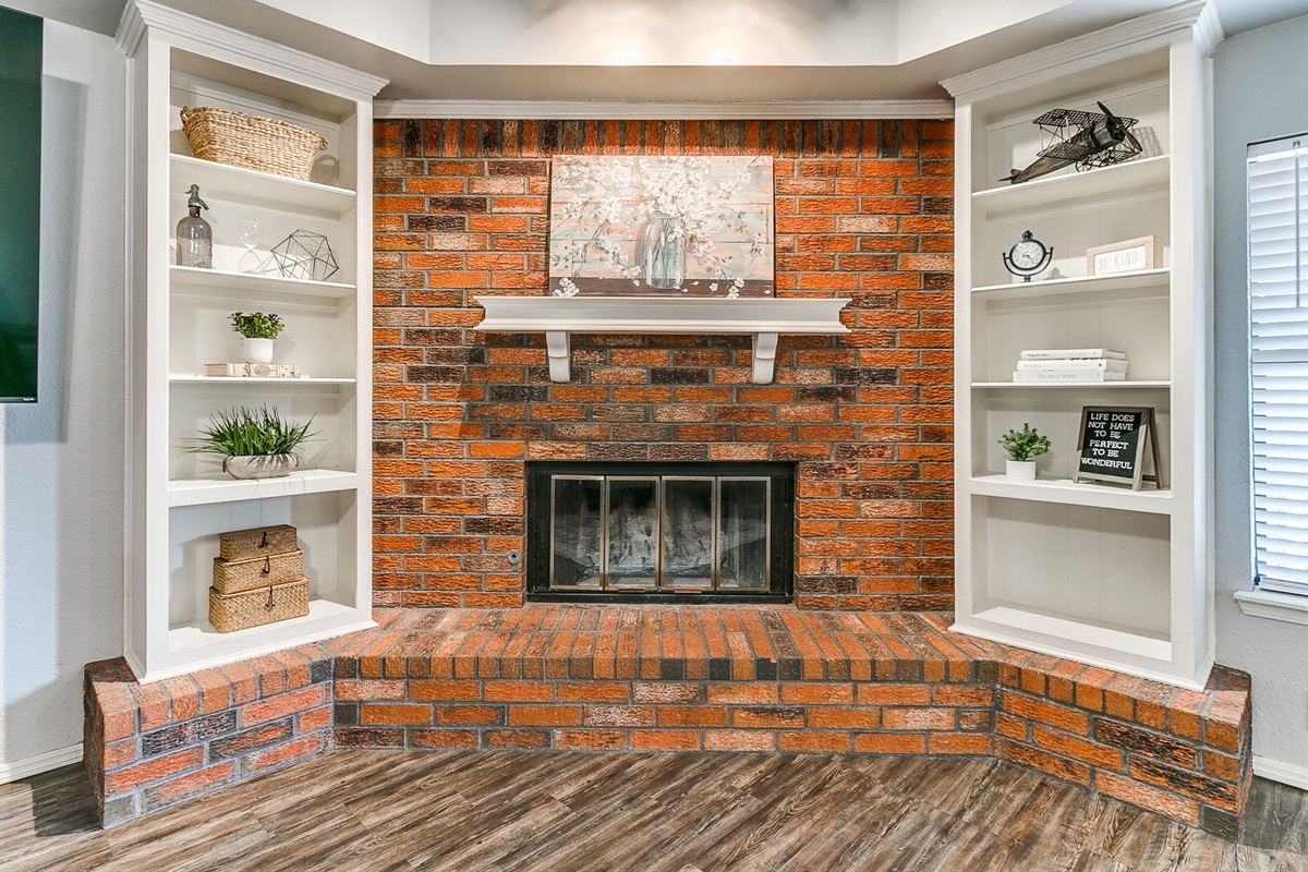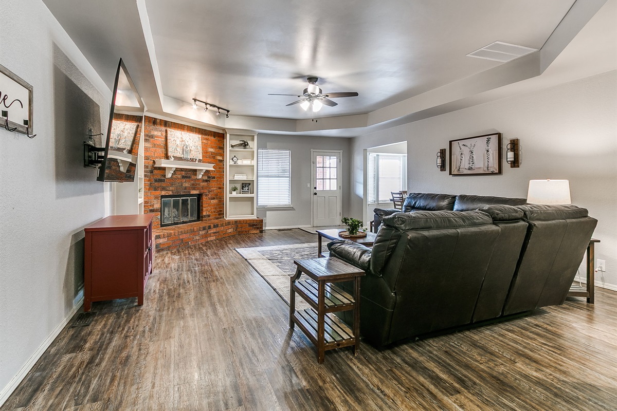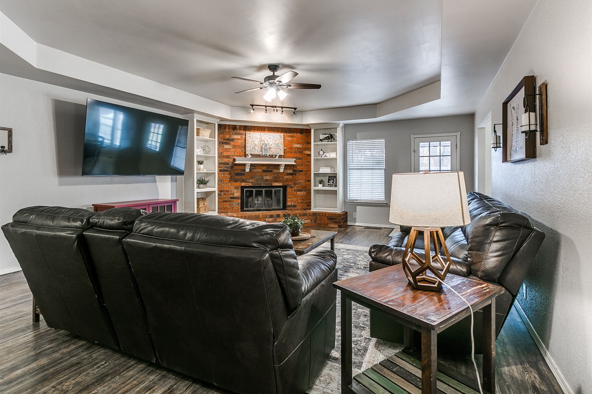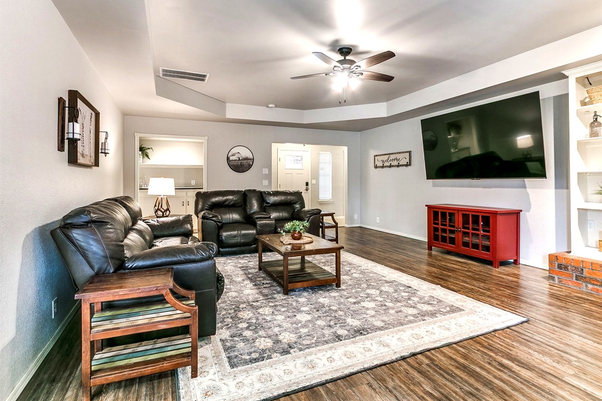 The open living area includes hardwood flooring, a gas fireplace, comfortable seating, and a large 85-inch TV — ideal for movie nights, sports, or relaxing after a long day. High-speed Wi-Fi supports both remote work and streaming.