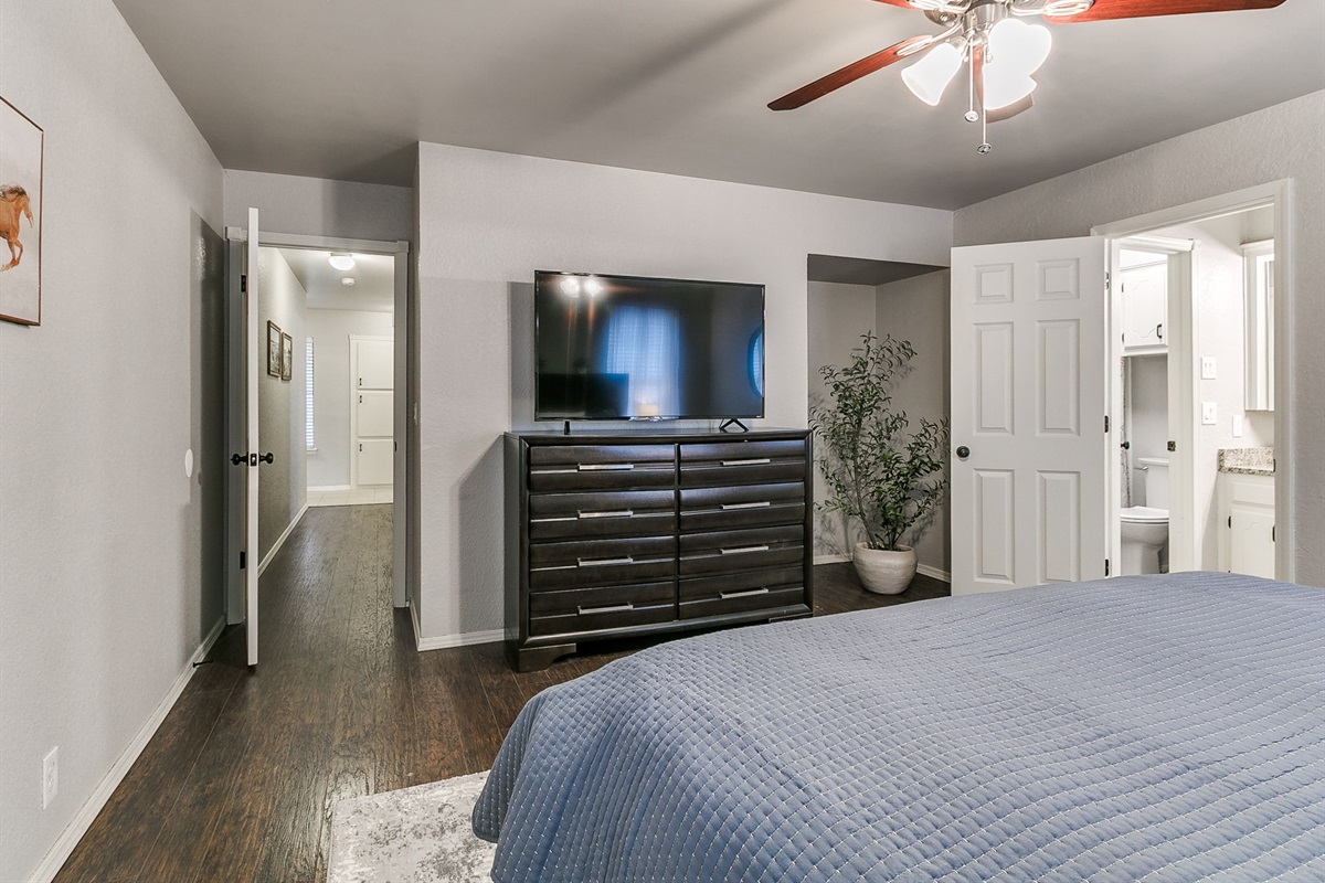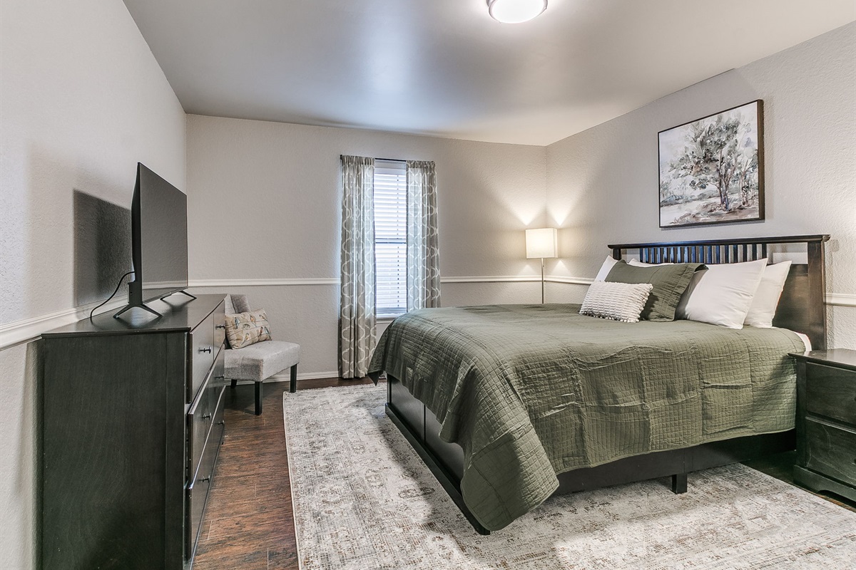 The home includes three true bedrooms. The primary suite features a king-size Purple mattress and private en-suite bath. Two additional bedrooms include queen beds, offering flexible accommodations for families, relocation stays, or corporate travel.